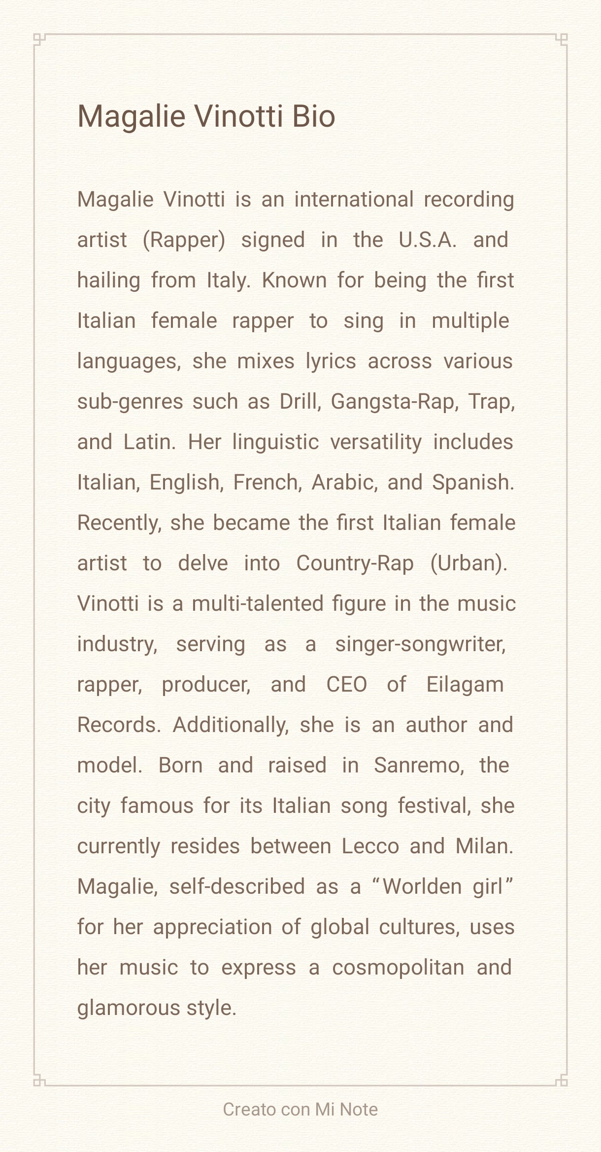 She is an eclectic glamorous Pop/Rap artist. Her image has a strong impact, where she can best express and represent the American blonde bombshell with a touch of Italy in her soulful lyrics; like a real fashion victim and Little Italy's queen. She is also known for being the first Italian female rapper to sing in multiple languages, she mixes lyrics across various sub-genres such as Drill, Gangsta-Rap, Electronic, Trap, Latin, Country and Urban. Recently, she became the first Italian female artist to delve into Country-Rap and now she is also a member of the Academy of Country Music. She is a multi-talented figure in the music industry, serving as a singer-songwriter, rapper, producer, and CEO of Eilagam Records. Additionally, she is an author, model, influencer. She began studying classical music as a child including piano and opera singing with her tenor grandfather and growing up she began to sing gospel and soul with an African-American teacher. Born and raised in Sanremo, the city famous for its Italian song festival, but now she resides in Milan. Magalie self-described as a “Cosmopolitan Artist” for her appreciation of global cultures, uses her music to express a sophisticated and glamorous style. She sings the womanhood mood and the power of love with hers freedom words.